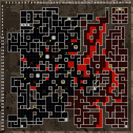 赤い床は溶岩で、入るとダメージを受けます。魔術師呪文LV4の浮遊光石で回避できます。