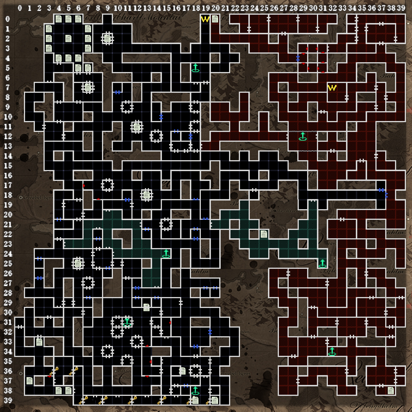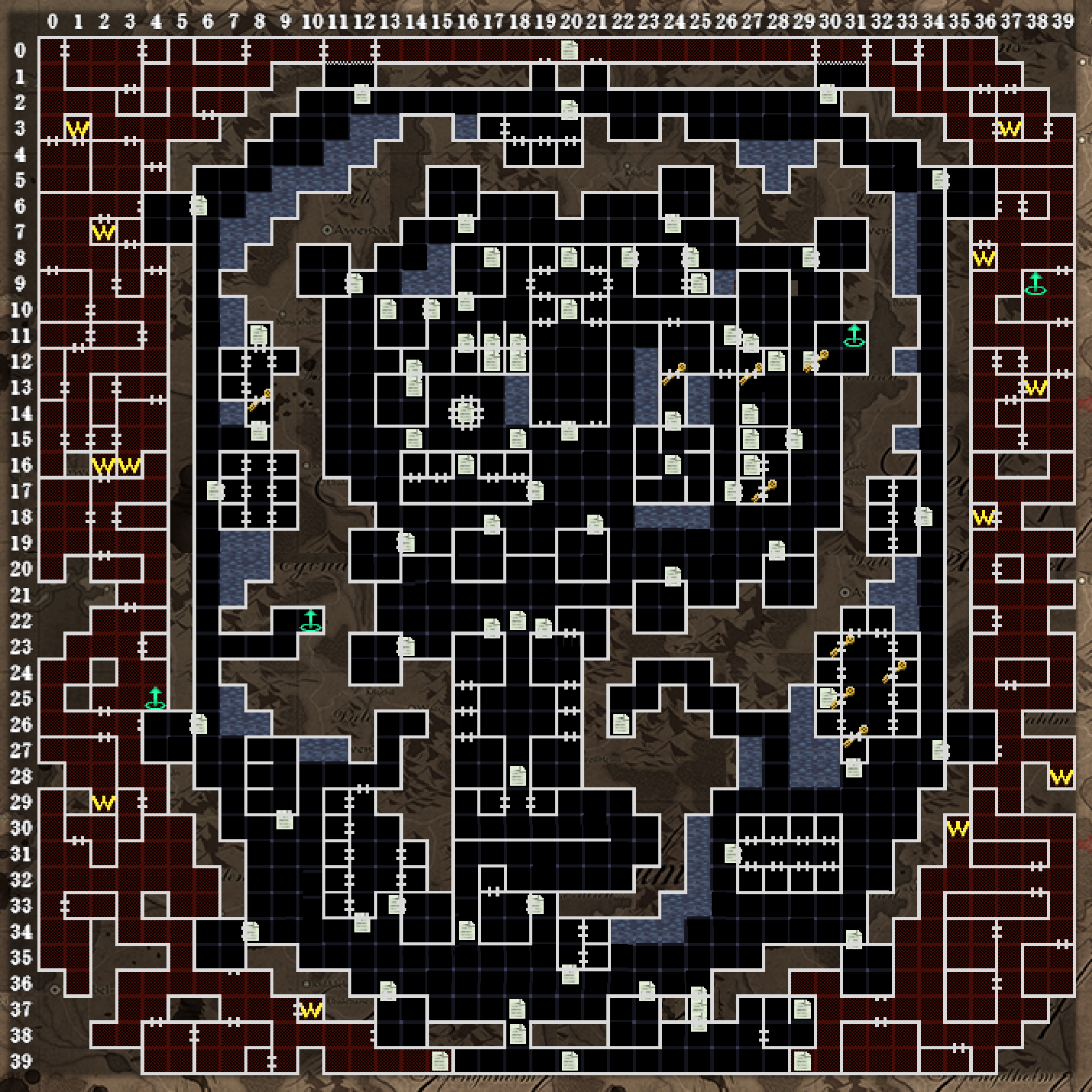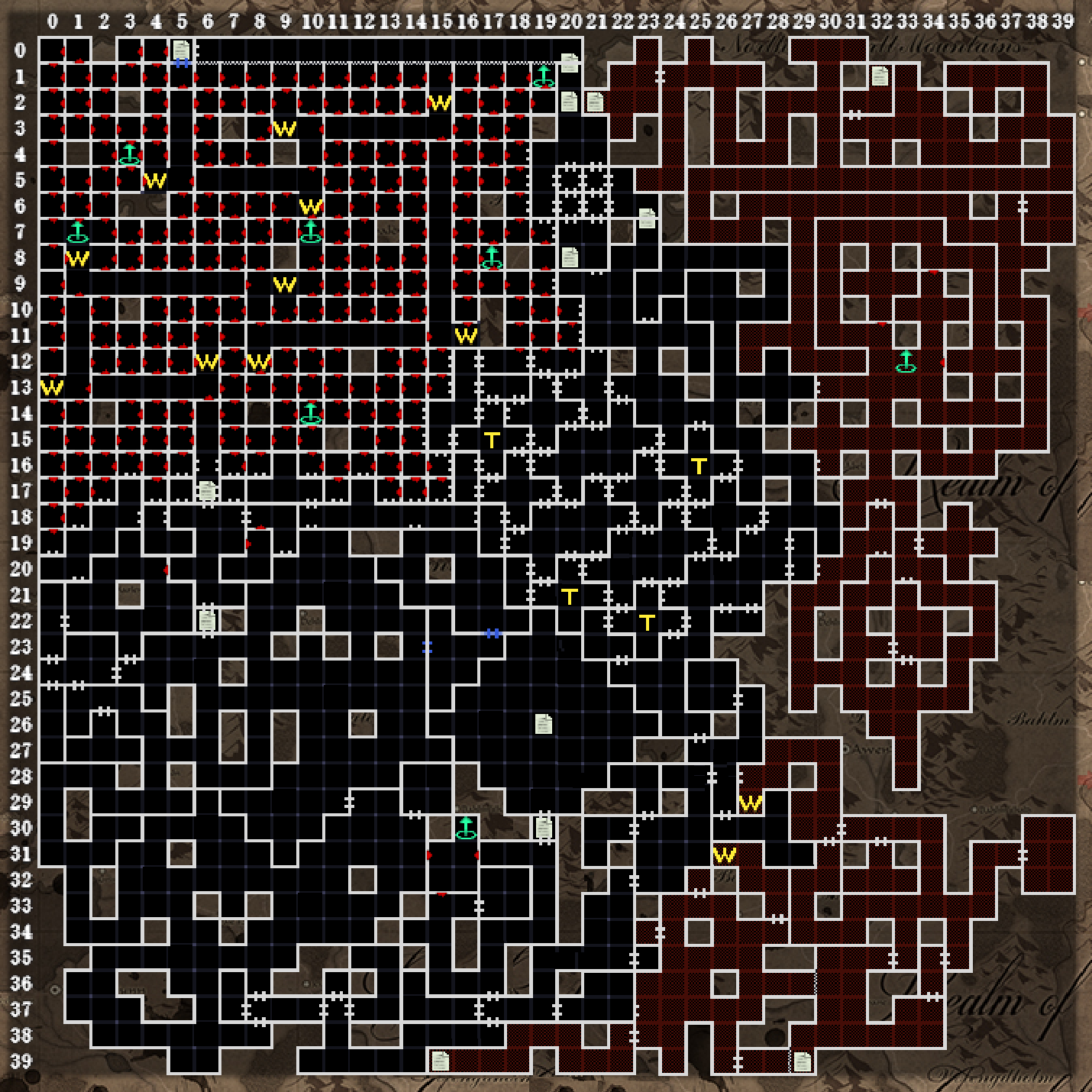 左上の迷いの葦原エリアは、シナリオ3+で探索します。(マップは見ないことを前提として)非常に抜けるのが大変なエリアですが、奈落B2F左上エリアの謎と、そこで手に入れたアイテムを(19.26)で使うことによって、抜け方のヒントが示されます。答えとしては、葦原入口(06.17)から北に4歩(4人の使徒)→西に5歩(5王)→…というように進めば、最短距離でゴール(05.00)にたどり着けます。