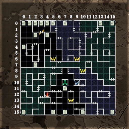 | 一部の📜マークや下り階段は、先へ進んでから出現します。 (24.37)(05.35)(33.37):回復の泉 (03.01):B2Fの(03.01)と通じます。 上中央の独立したエリアは、戦闘中の空間転位で入れることがあります。失敗すると石の中に入るので注意。 (19.01):トダーリンがいます。街の商店と同じ役割です。 |