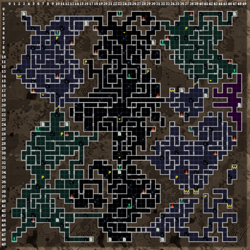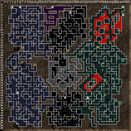 | このフロアから50×50マスと、マップがさらに大きくなりますが、1フロアずつではなく、他のフロアも含め部分的に探索していくことになります。最初は(24.48)からのスタートです。一部の📜マークは、先へ進んでから出現します。 (23.34)(07.24)(23.26)(14.18):長いロープで降りられます。 (30.07)(16.03):回復の泉 (36.17):剣を持たせると、(10.23)にワープします。 (03.01):B3Fの(03.01)と通じます。 右中央の独立したエリアは、戦闘中の空間転位で入れることがあります。失敗すると石の中に入るので注意。 (48.20):トダーリンがいます。街の商店と同じ役割です。 |