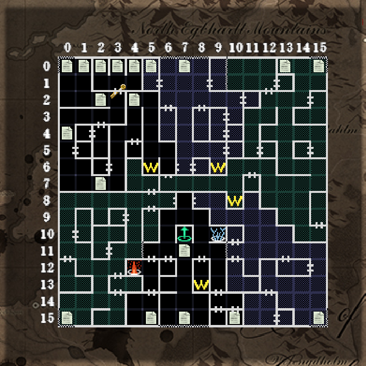 | (22.27):フロアについて、色々と解説してくれる人物がいます。補足として、一部のエリアは宝箱の罠によるテレポートだけでなく、戦闘中に空間転位を使うことによっても侵入できることがあります。また、フロア内にもランダムに転位するポイントがあり、未踏破エリアにも侵入できることがあります。なお、B1F~B3Fや他のダンジョンでも戦闘中の空間転位で同じことが出来ますが、石の中に入る危険性があります。 |