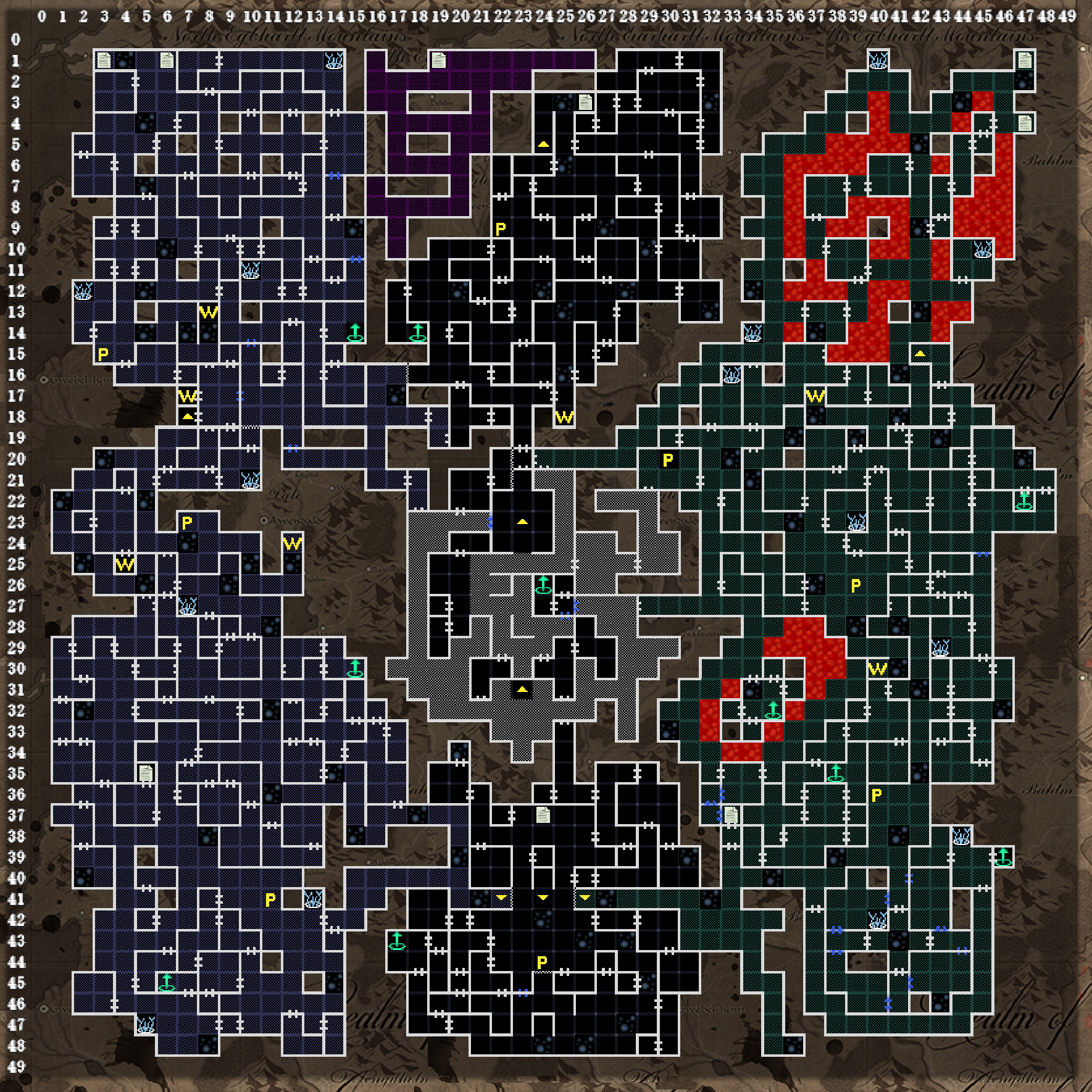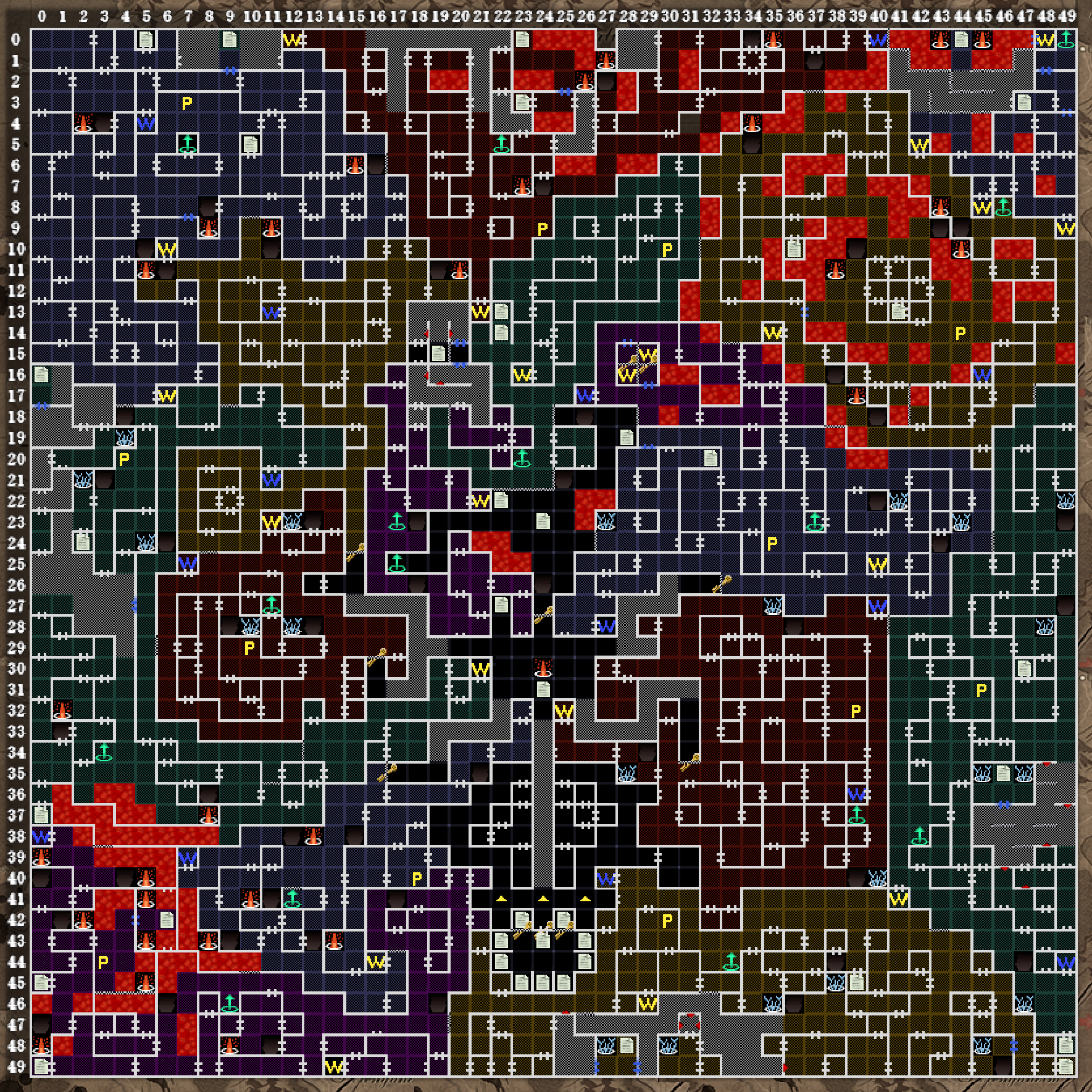 | このフロアから50×50マスと、マップがさらに大きくなりますが、1フロアずつではなく、他のフロアも含め部分的に探索していくことになります。最初は(24.48)からのスタートです。一部の📜マークは、先へ進んでから出現します。 (23.34)(07.24)(23.26)(14.18):長いロープで降りられます。 (30.07)(16.03):回復の泉 (36.17):剣を持たせると、(10.23)にワープします。 (03.01):B3Fの(03.01)と通じます。 右中央の独立したエリアは、戦闘中の空間転位で入れることがあります。失敗すると石の中に入るので注意。 (48.20):トダーリンがいます。街の商店と同じ役割です。 |