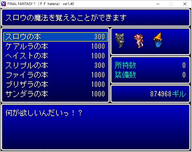 お店で購入したり、宝箱から手に入れる。白魔法と黒魔法の2種があるが、仲間の二人はどちらも習得可。組み合わせは自由自在!