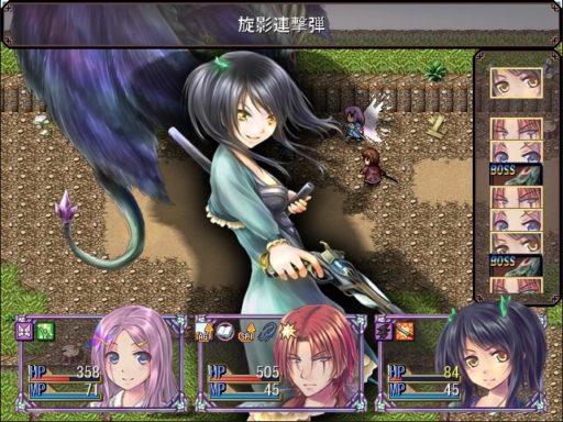| 特徴 | 4人制+控え 主人公+仲間全員女性 ターン制バトル 通常攻撃なし ボーナス経験値 スキルポイント習得制 自作グラフィック 街・ダンジョン・ワールドマップのショートカットモード エンカウントON・OFF切り替え モンスター図鑑 どこでもセーブ アイテム詳細機能 会話詳細機能 テキスト飛ばし クエスト キー押しっぱなしで高速戦闘(多用するとフリーズするので注意) 様々な効果のクラフトカード あらすじ・目的表示 チャットイベント 2段階クラスチェンジ 召喚獣バトル 隠しダンジョン 引継ぎ周回 |