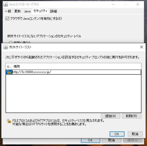 JAVAをダウンロードしたら、スタート画面のアプリにフォルダが追加されているので、JAVAの構成を開きます。セキュリティタブから、サイト・リストの編集をクリック。左図のような画面が開くので、見たいサイトのアドレスをコピーし、追加を押し空欄をクリックして、Ctrl+Vで貼り付けます。