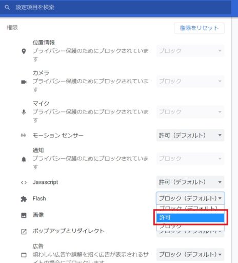 左図のような設定画面が出ます。Flashの設定が、初期では「ブロック(デフォルト)」となっていますので、プルダウンメニューから「許可」を選びます。これで完了です。表示が変わらない場合は、一旦ブラウザを更新してみてください。