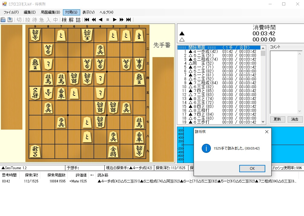 史上最長手数1525手詰めの「ミクロコスモス」も解ける詰将棋専用の高性能エンジン。詰将棋専用ですので、対局は出来ません。「よかとき」や「将棋所」のみでは、やや正確性に欠けるので、「脊尾詰」の導入がお勧めです。