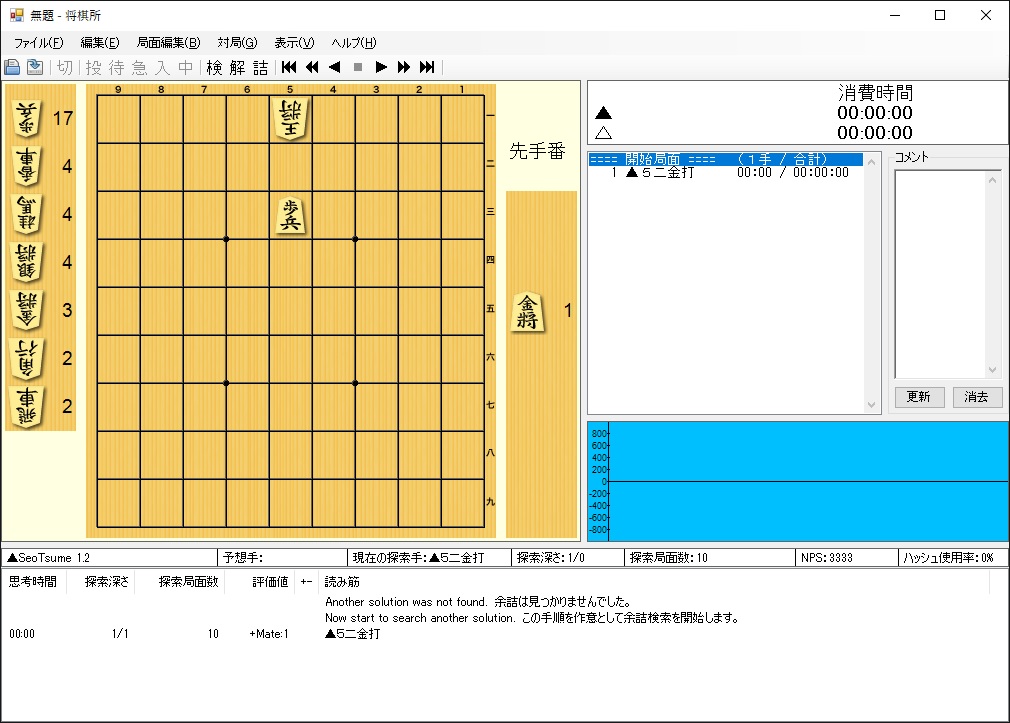 変化を調べるときは、局面編集で駒を動かしてから解かせます。この時、後手番になっているときは、局面編集の手番変更で先手番にしてから解かせてください。