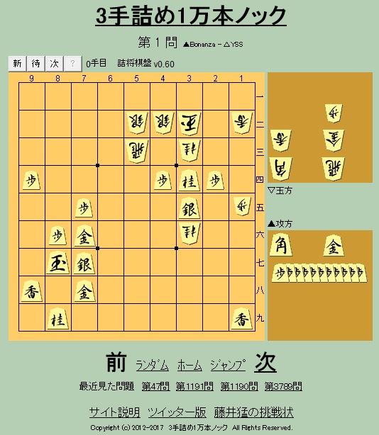 3手詰め1万本ノック – 実戦詰め将棋(IE終了のため不可、下記Xのみ可)