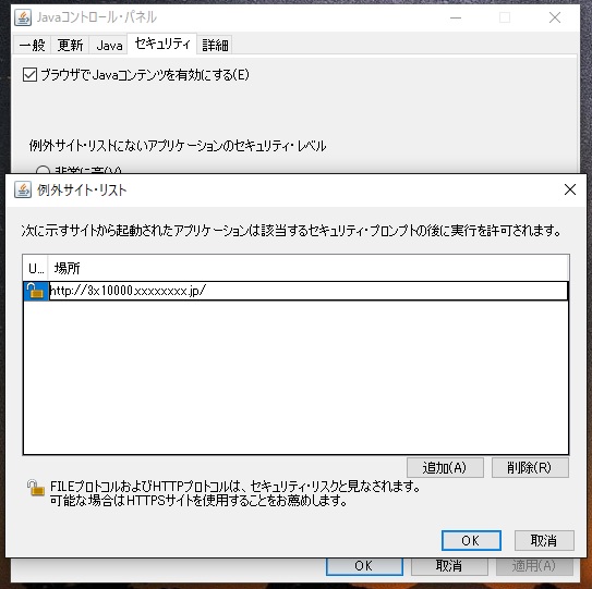 JAVAをダウンロードしたら、スタート画面のアプリにフォルダが追加されているので、JAVAの構成を開きます。セキュリティタブから、サイト・リストの編集をクリック。左図のような画面が開くので、見たいサイトのアドレスをコピーし、追加を押し空欄をクリックして、Ctrl+Vで貼り付けます。