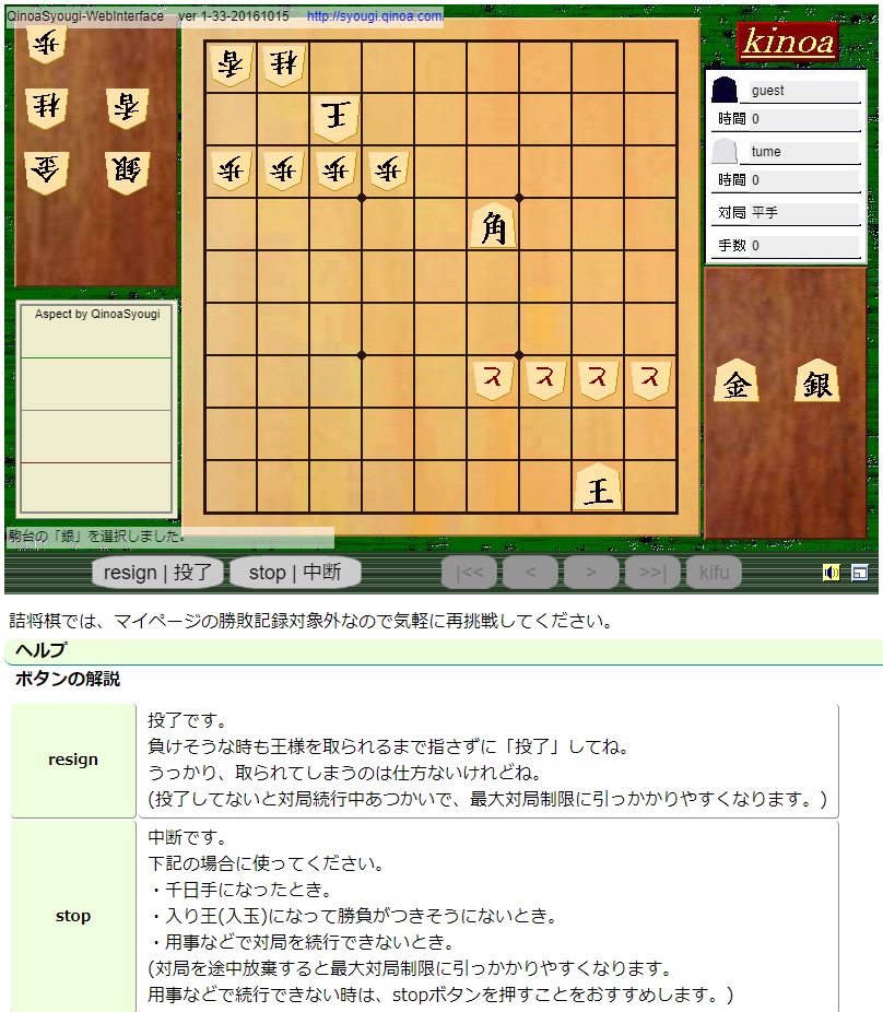 将棋のフリーソフト「きのあ将棋」の公式サイト。全部の駒は使っていないが、実戦詰将棋に近い駒余りありも含む問題を掲載。問題は280題。