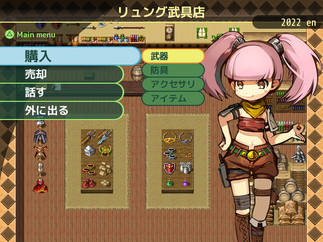 | 「いらっしゃいませー!あら、キミは初めてのお客さん?アタシはリュング。ウチは装備品や冒険に役立つアイテムを売っているの。見たところ、キミたちも冒険者みたいね。だったら、ウチで装備を揃えていったら?安くしておくわよー!」 |