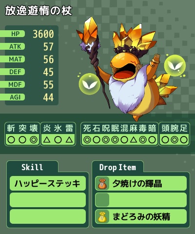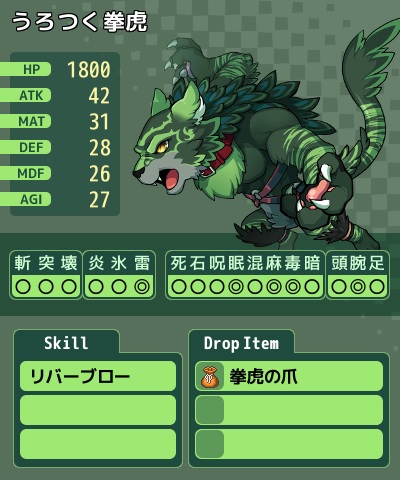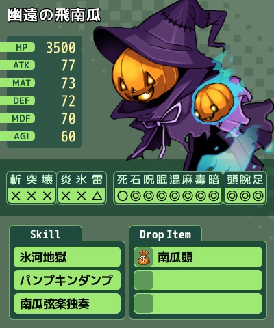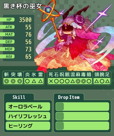 (以下無記入は同じ、HP半減でライフドレインとウィンドストーム追加)
